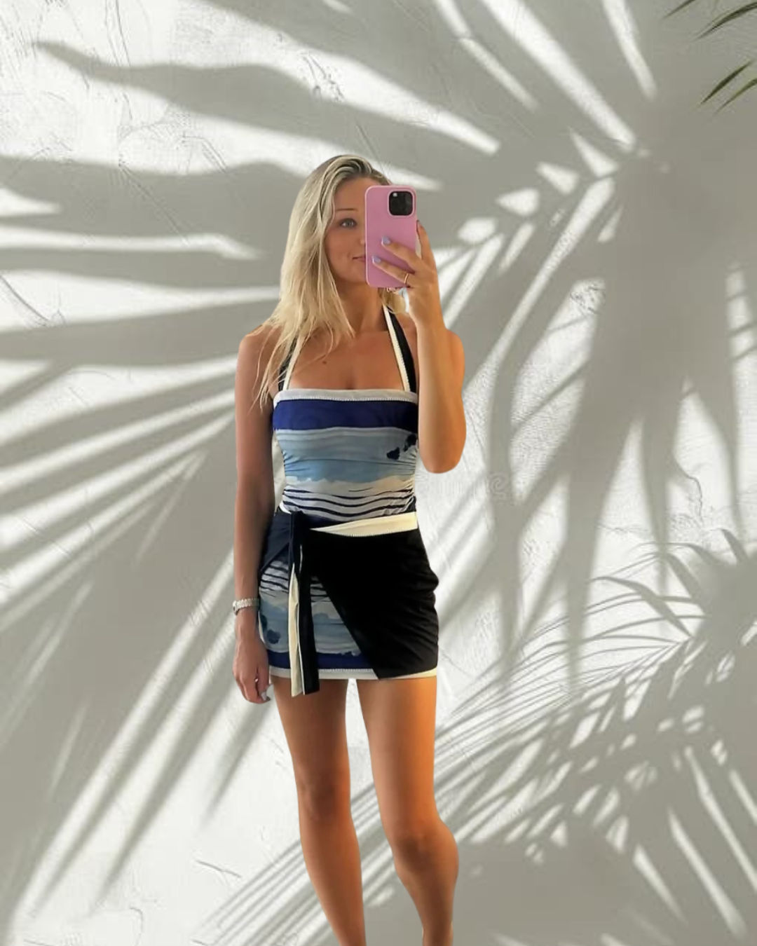 The Breeze Mini Dress is a fitted mini silhouette crafted from SIR. signature stretch mesh, in an exclusive Shoreline Stripe print inspired by undulating seascapes. It features a straight neckline with a halter strap and skirt overlayer with an adjustable tie at the waist.
